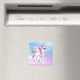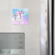Um ímã com a imagem de um unicórnio com grandes olhos azuis, asas cor-de-rosa e um arco-íris e cauda. Kawaii fofo.