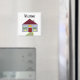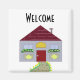 Uma bela "bem-vinda". Excelente para novos vizinhos ou para sua própria casa. Uma pequena casa azul com um telhado vermelho profundo. Caixas de flores e um caminho de rodovia levam para a porta frontal.