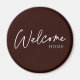 Um ímã de cozinha moderno com "Welcome Home" em tipografia elegante e minimalista de tinta. Edite facilmente este design maravilhosamente simples para mudar de cores, se necessário, para corresponder à sua decoração atual. Vários tamanhos para escolher em forma quadrada ou redonda. Faz um presente excelente de inauguração.