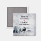 Um imã de aniversário com uma imagem de aquarela apresentando uma rena preta de silhueta, entre alguns pinheiros. Esquema de cor neutra a preto e branco.