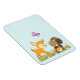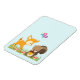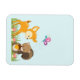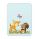 Um ímã felxível com uma ilustração fofinha apresentando um veado bebê e um pequeno esquilo segurando uma bolota e uma borboleta voando sobre suas cabeças. Estas adoráveis criaturas de floresta em pé sobre uma grama com alguns cogumelos brancos perto de seus pés. Fundo azul claro.