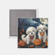 Libere o espírito assustador com esta design sombria do Dia das Bruxas apresentando um bando de cachorros sob um céu escuro e iluminado, cercado por morcegos voadores e abóboras brilhantes. Perfeito para aqueles que amam um toque de diversão terrível com seus amigos peludos!