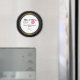 Um imã de casamento com um design de casamento de estilo moderno - lábios de kissy cor-de-rosa glamourosos e uma ilustração de bigode retrógrada masculina. Colocado sobre um fundo de quadro negro com um quadro circular de gradiente dourado no centro. O texto diz que o Sr. e a Sra. podem personalizar com seus nomes e data de casamento.