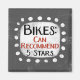 Um design tipográfico engraçado que diz "Bikes: Can Recommended, 5 Stars". É texto preto e vermelho em um retângulo branco com pontos brancos engraçados e brincalhões ao seu redor, tudo em um fundo de cinza.