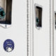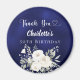 A navy blue background decorated with white florals, roses. The blue color is uneven. Personalize and add a name and age. White letters. Text: Thank You with a heart.