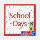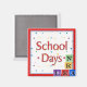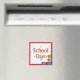 O divertido e colorido design apresenta vários decapantes coloridos e blocos de alfabeto quadrado que soletram Aprender. O texto diz Dia da Escola em vermelho. Sotaque de borda azul e vermelha.