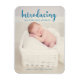 "Apresentando" na letra de escrita de letras manuais e caligrafia em azul, com fotografia vertical do recém-nascido. Anúncio de nascimento elegante e moderno.