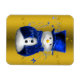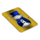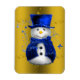 Um padrão de Natal bonito e colorido com neve vestida de chapéu de veludo azul e coletes, sobre um fundo festivo de ouro com estrelas de ouro para adicionar um toque na moda e caprichoso às suas decorações natalinas este ano.