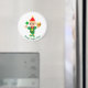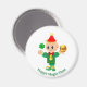 Belo ímã com boa sorte, elfo fofo, shramock e bola de ouro. O bonitão vestindo vestido verde está segurando um trevo para boa sorte! O texto "Tempo mágico feliz" pode ser personalizado!