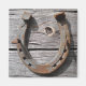 Uma imã de geladeira com uma ferradura velha com ferrugem vermelha na sua superfície. A ferradura pendura sobre uma velha cerca de velhas tábuas de madeira nocauteadas de prata. Fácil de personalizar. Use o botão Personalizar para personalizar totalmente o design. Ideal presente simbólico para expressar boa sorte ou parabéns, ou para aqueles que desfrutam de um estilo de vida rural rústico que a imagem simboliza.