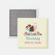 Um imã com um ditado engraçado - Trabalhando até o sorvete. Ilustrada com um bar de chocolate, um sundae de 3 scoop com cobertura de chocolate, borrifadas e uma pequena cereja no topo. E um float de morango com chantilly.