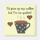 Uma caneca de café de cinza escura com bolinhas brancas e dentro de café a vapor. Dois corações de chocolate e um excelente dizendo para um bebedor de café.