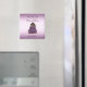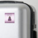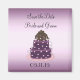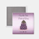 Um bolo de casamento moderno em roxo com bolinhas brancas e um laço de chocolate. Um fundo roxo sombreado acentua os nomes e a data do casamento.