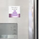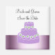 Um design bonito com um bolo de casamento roxo com flores brancas e centros verdes e glacê branco macio. Uma borda de roxo sombreado. Personalize com nomes e data conforme desejado.