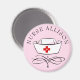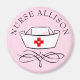 Este ímã apresenta um boné de enfermeira com uma cruz sobre ele junto com um florescimento decorativo por baixo. Acima está o nome de uma enfermeira para você personalizar. O plano de fundo é cor-de-rosa, mas pode ser personalizado. Perfeito para uma enfermeira ou formando de uma escola de enfermagem.