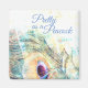 Penas de pavão em apuros, cores pastéis de púrpura, rosa, ouro e chalé. Diz "Bonito como Pavão" em roxo.