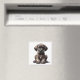 Retrato de um filhote fofo deitado, mostrando seus olhos expressivos e seu olhar atencioso, enfatizando uma presença animadora e carinhosa.