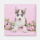 Um lindo filhote de rouco a brincar com rosas cor-de-rosa num fundo rosa.