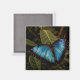 A borboleta Blue Morpho mostra suas brilhantes asas azuis ( 5 - 8 polegadas de extensão) enquanto repousa na folhagem na terra maravilhosa da borboleta. Foto de Ruth Jolly.