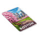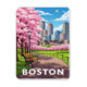 Uma cena pitoresca de parque com cerejeiras florescentes armando uma vista do horizonte de Boston sob um céu azul brilhante com nuvens fofinhas.