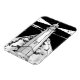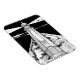 Uma ilustração a preto e branco do farol no final do banco de pedras em Nelson, Nova Zelândia. Este farol está no corte perto e tem a ilha de costa ao fundo.