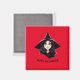 A design mostra uma ilustração de uma bruxa jovem com cabelo preto e um chapéu preto pontiagudo, junto com as palavras "Feliz Halloween!" O design é baseado em uma ilustração digital.
