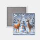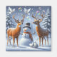 Um boneco de neve com nariz de cenoura em um chapéu preto fosco sorri entre dois veados. Um cervo sopra alegremente bolhas transparentes coloridas no céu nevado, enquanto as pombas voadoras brancas se olham contra o pano de fundo de uma cinza nublada.