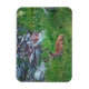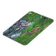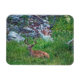 Uma fotografia de um cervo macho deitado na grama e flores silvestres que crescem entre uma parede natural de pedra em uma floresta. Esta fotografia de perto de um veado macho é a mesma grana na minha fotografia intitulada "A Buck Rest at a Cascading River". Copyright © 2018 Kimberly J Tilley.