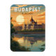 Design de viagem de vetor retrô de Budapeste em estilo emblema. Budapeste, capital da Hungria, é bissecada pelo rio Danúbio. Sua Ponte em Cadeia do século XIX conecta o distrito de Hilly Buda com Pest plano.