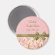 Mostrado aqui como um favor de manutenção para um chá de panela, este moderno design de flores em rosa suave e verde pode ser personalizado para qualquer evento simplesmente mudando as opções de texto. Folhas de véu num campo feminino de sorvete cor-de-rosa com fita adesiva de seda. Perfeito para festas de cocktail, casamentos, aniversários, chás de fraldas, aniversários, aposentadoria ou festas de noivado - ou qualquer evento especial!