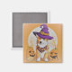 Welsh Corgi no disfarce de Halloween sentado numa vassoura e vestindo chapéu de bruxa com abóboras no seu lado