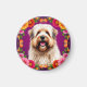 Retrato de cachorro fofo rodeado por flores vibrantes, criando um design alegre e colorido.