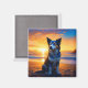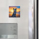 Um cachorro sentado numa praia no pôr do sol, ai art. Cachorro tem um ímã.