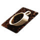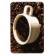 Este ímã flexível exibe uma xícara de demito branca, cozida a vapor de café recém-fabricado, em uma cama de café torrado escuro e marrom.
