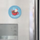 Magnet com um bonitinho bonitinho a gozar um mergulho numa xícara de chocolate quente de cacau como se fosse uma banheira quente. Mas, junto com a cana-doce, ela está derretendo. O texto diz "Fique quente e convencido". Ilustração adorável para feriados de Natal.