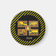 Este design apresenta quatro caminhões clássicos de construção em amarelo-negrito dispostos juntos em um fundo castanho e preto. Inclui outros itens de construção, como trilhos de guarda e cones de trânsito e faixas de tráfego preto e amarelo. Nós o cobrimos para uma festa temática sobre caminhões de construção: suprimentos, decoração, deliciosos doces e presentes personalizados significativos!