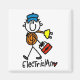 Um eletricista fixe em um boné azul segura um rolo de arame e uma caixa de ferramentas sobre T-shirts, canecas, capuzes, cartões, autocolantes, chaveiros, sacos de tota e outros roupa e presentes elétricos.