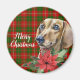 Ilustração aquosa de cão Dachshund castanho com spray floral de poinsettia sobre fundo verde festivo e xadrez vermelha. O texto "Feliz Natal" pode ser alterado para Personalizar com nome ou outra mensagem de feriado