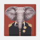 Esta design apresenta um retrato de um elefante vestido com um uniforme militar.