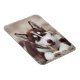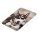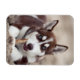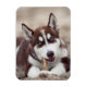 Um cachorrinho siberiano marrom e branco com olhos azuis comendo pau de madeira na praia.