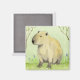 Uma pequena pintura aquosa de Capybara sentada entre flores azuis na primavera.