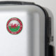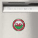 Uma representação em 3D da bandeira nacional galesa, sentada no meio da design A capital, Cardiff, está no topo da imagem, e o país, País de Gales, está no fundo da imagem. Entre as duas partes do texto estão estrelas decorativas e duas pulgas de lista.
