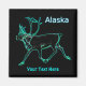 Uma renderização brilhante, semelhante a neon, de uma rena (Rangifer tarandus), também conhecida como rena. Leitura de texto, "Alaska" aparece em azul e branco brilhantes. Personalize adicionando seu próprio texto adicional. Inspirado pelas luzes do Norte.