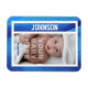 Comemore o nascimento do seu lindo bebê imortalizando-o no seu primeiro cartão de beisebol. Basta adicionar a foto do seu bebê e editar o primeiro e o nome do meio, bem como o nome da equipe, que também é o sobrenome da família. A borda do cartão magnético é uma imagem de tecido de malha azul comumente usada para uniformes esportivos.