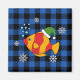 Uma ilustração de um peixe de laranja amarelo tropical, de natal, sob o oceano, com bolhas sobre um fundo de búfalos preto azul com verificação de padrão. Este design de desenho bonitinho é uma ideia de presente para amantes do Natal, amantes da pesca e amantes do ronco.