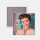 Kitschy imã de geladeira tem uma dona de casa estilo 1950 com o texto "casa é onde está o vinho".