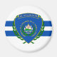 A casaco de braços de El Salvador é infundida numa forma de escudo que ela própria assenta sobre uma coroa verde. Toda a imagem está embutida nas listras azul e branca que são representativas da bandeira El Salvadoriana.