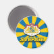 A casaco nacional de armas de Sverige (Suecia), mais o nome do país, são colocados em uma design de perspectiva sobre um fundo estelar, que exibe as cores da bandeira nacional.
