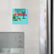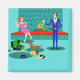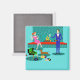 Este Casal Retroativo com o Cachorro Magnet parece uma cena de uma comédia romântica. O estilo da década de 1960, design de arte minimalista apresenta um casal atraente desfrutando de uma noite romântica em casa. A sala sofisticada apresenta de forma destacada um aqua e uma lareira de tijolos com uma borda vermelha brilhante. Uma linda mulher ruiva vestindo um vestido rosa brilhante está empolgada na borda. Ela está desfrutando de um martini com uma azeitona flutuante, um fogo rugido, boa música, e a empresa um homem alto, escuro e bonito. O homem está vestindo um terno azul e gravata vermelha. Seu copo de martini é criado para brindar seu charmoso companheiro. Por outro lado, ele está segurando um álbum de vinil. Aos seus pés, vemos um dachshund adorável vestindo um colar vermelho. O cão brincalhão está caminhando na direção de um toca-discos verde com pernas de eixo laranja. No chão, há um grupo colorido de registros divertidos, ecléticos, vinílicos. Saúde! Aqui está a noite perfeita em casa.