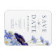 Bonita mão elegante pintou primavera de aquarela e flores de verão, incluindo flores silvestres em azul marinho, azul de córnflor, roxo, verde e amarelo, casamento salvar o ímã de datas. O primavera único pintado à mão e o trabalho de arte de flores de verão incluem cosmos, flores de milho, papoilas e me esqueçam de nãos com folhagem. Modelo fácil de usar com moderno e elegante roteiro de tipografia. Perfeito para um único casamento floral azul botânico temido no verão ou na primavera. Arte original de Catherine Sweetman. Encontre itens correspondentes na elegante suíte de casamento floral azul de verão